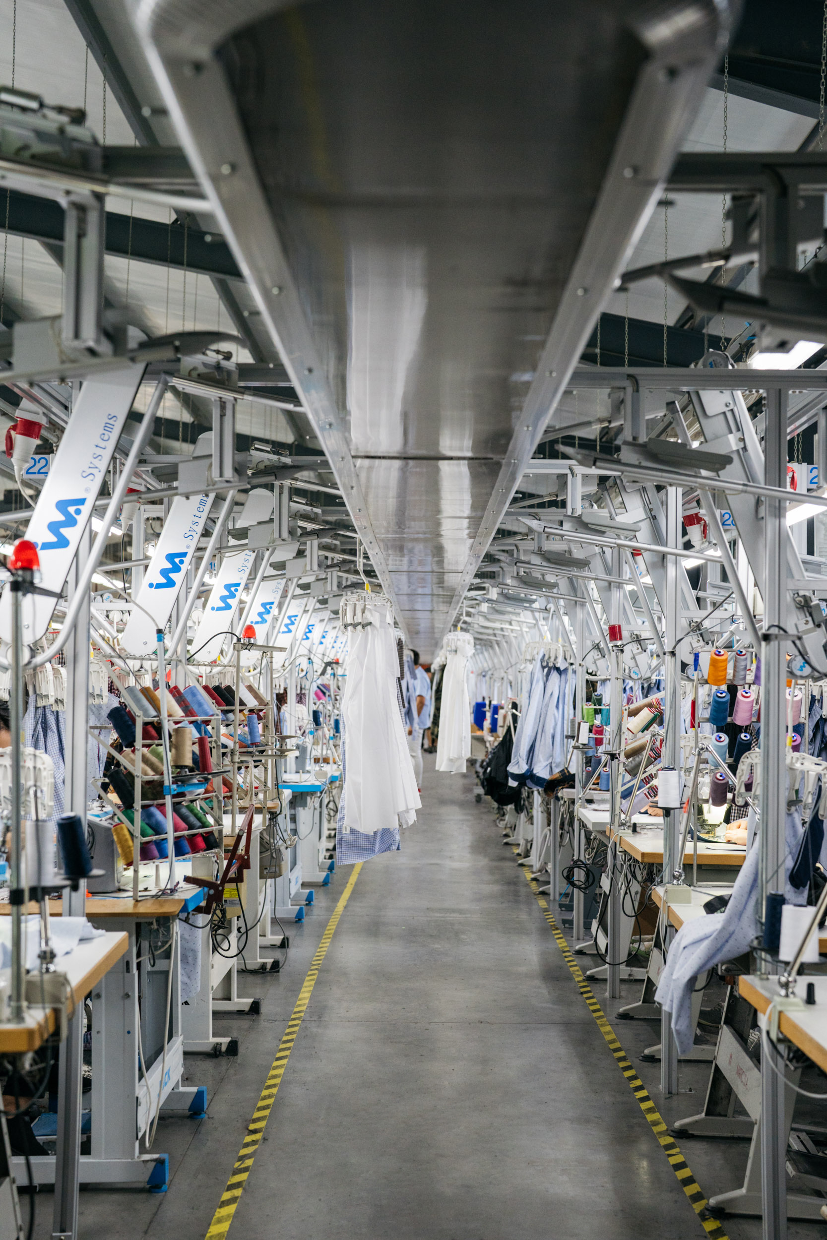 Contamos con la tecnología y los automatismos más avanzados de la industria, difíciles de ver hoy en día en Europa: corte automático, tres bordadoras de 6 cabezales autómatas de tapetas, ojales, puños, cuellos, botones, un carrusel de distribución aérea autónomo, centro de planchado robotizado, etc.